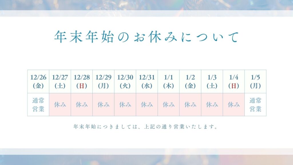 年末年始のお休みについて 2025 12/16 お知らせ 2025.12.16 お知らせ お盆期間中のお休みについて 関連記事 お盆期間中のお休みについて 2025.07.29 ゴールデンウィーク中のお休みについて 2025.04.16 ホームページをリニューアルしました 2024.02.05